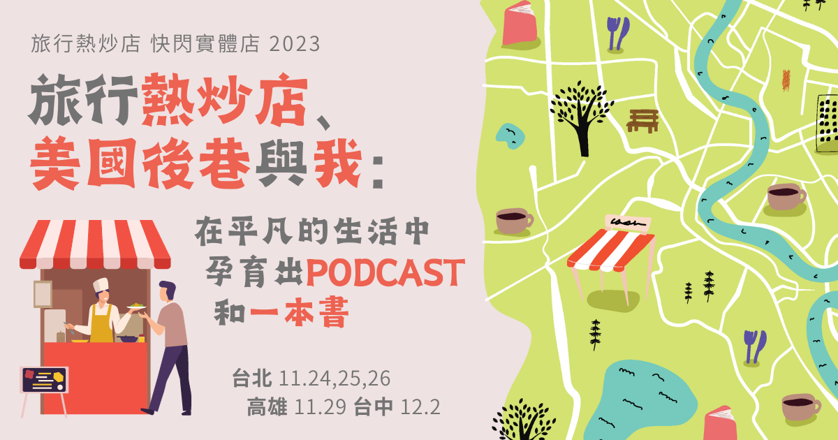 《旅行熱炒店》是由一位熱愛旅行與世界地理的平凡上班族,利用下班後時間製作經營的PODCAST節目。這次實體活動的主題是《旅行熱炒店、美國後巷與我:平凡生活中孕育出的一個PODCAST與一本書》,主廚Jerome將暫時脫離主持人的角色,和大家聊聊他的日常生活、過去的經歷,以及這些如何形塑了大家今天看到的節目樣貌,當然還有那些節目上沒講、書上也沒寫的幕後小故事!